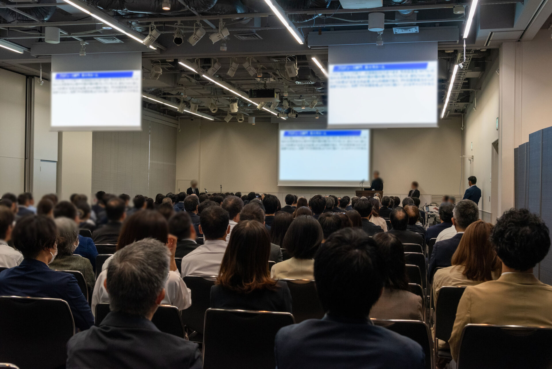 会議椅子/会議机/丸テーブル/司会台/ステージ/天吊メインスクリーン/天吊サブスクリーン/ワイヤレスマイク/4つ折りパーテーション