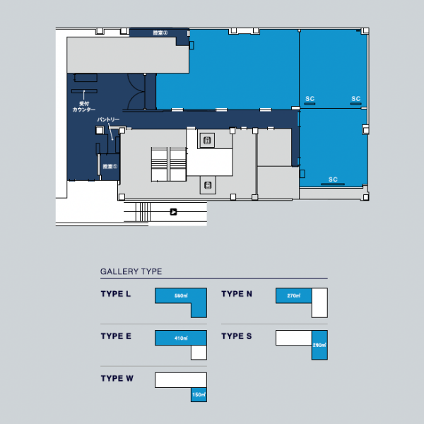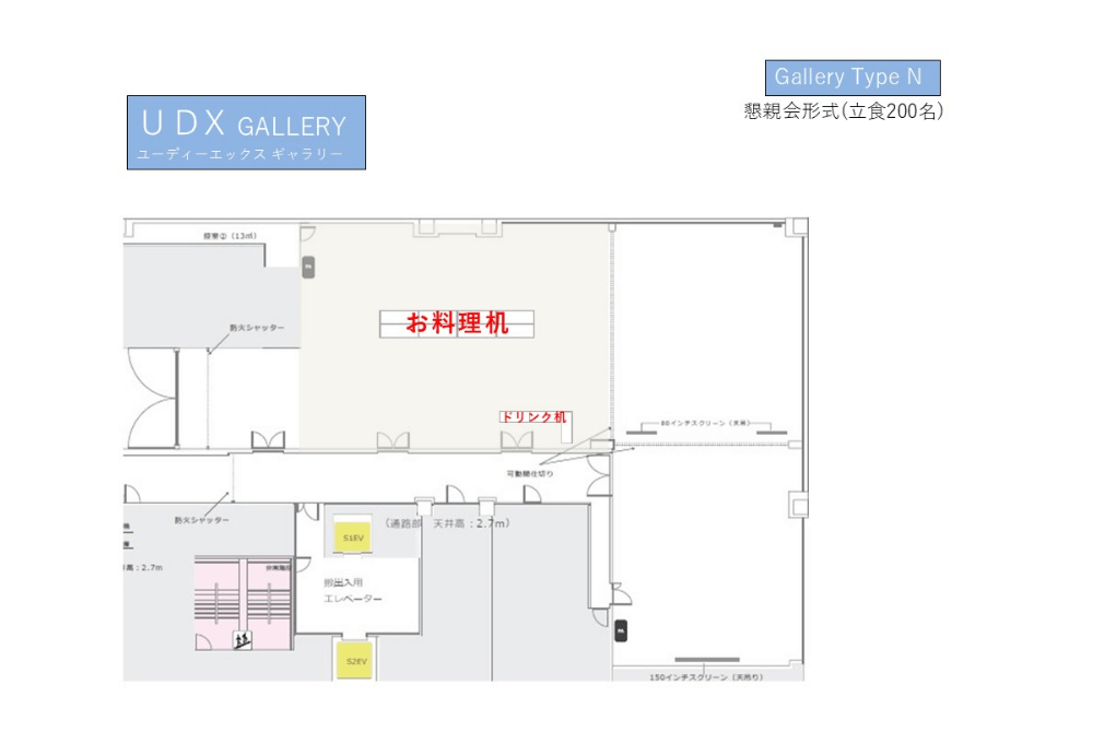 ※L字型の会場を稼働壁で2部屋に仕切ってご利用ただける会場です。TypeN/TypeSとTypeE/TypeWの2通りに仕切ることが可能です。