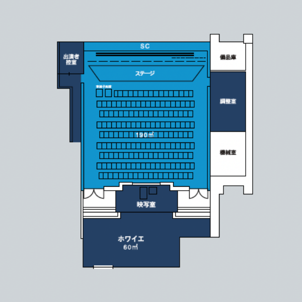 ホワイエ面積:60.0 ㎡、ホワイエ天高:4.2m、4階控室面積:7.5㎡、4階控室スクール:6名